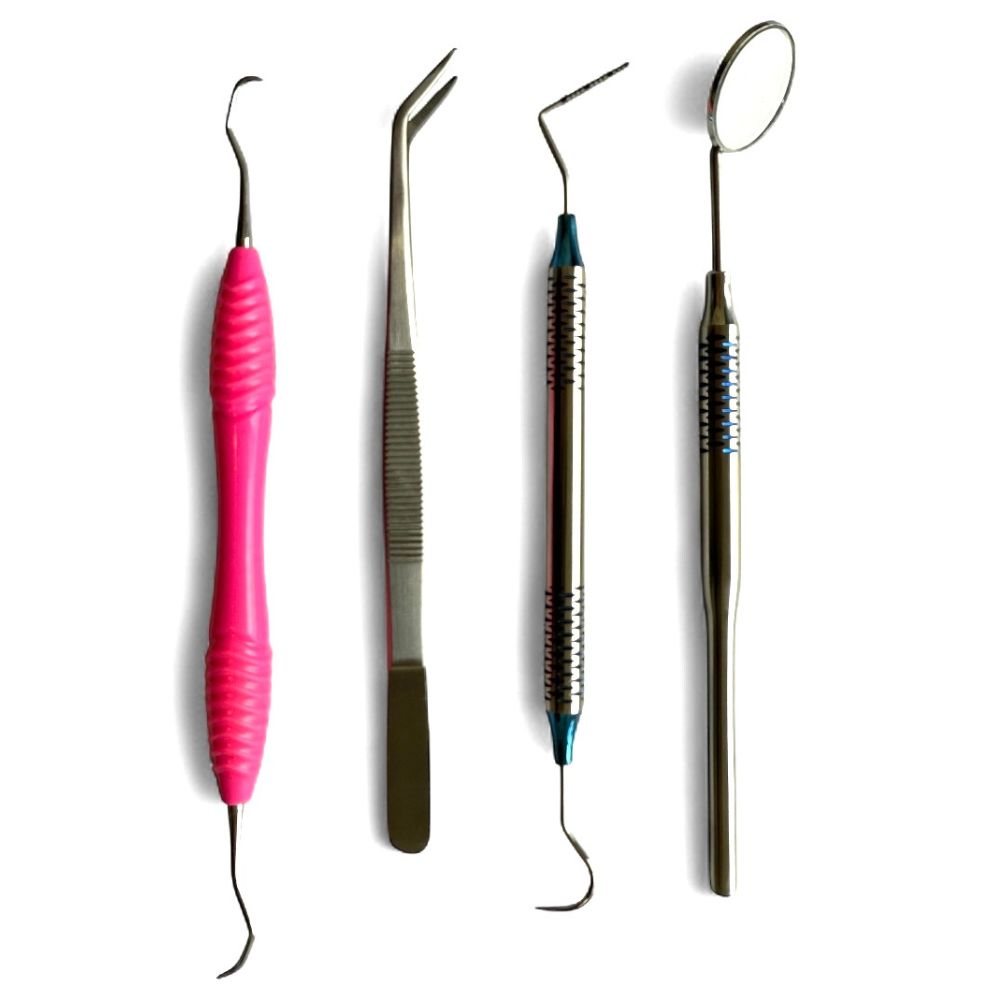 Kit especial para Periodontia, contendo 1 Pinça, 1 Sonda modificada (exploradora + periodontal), 1 espelho com cabo e 1 Cureta Gracey com cabo em silicone.