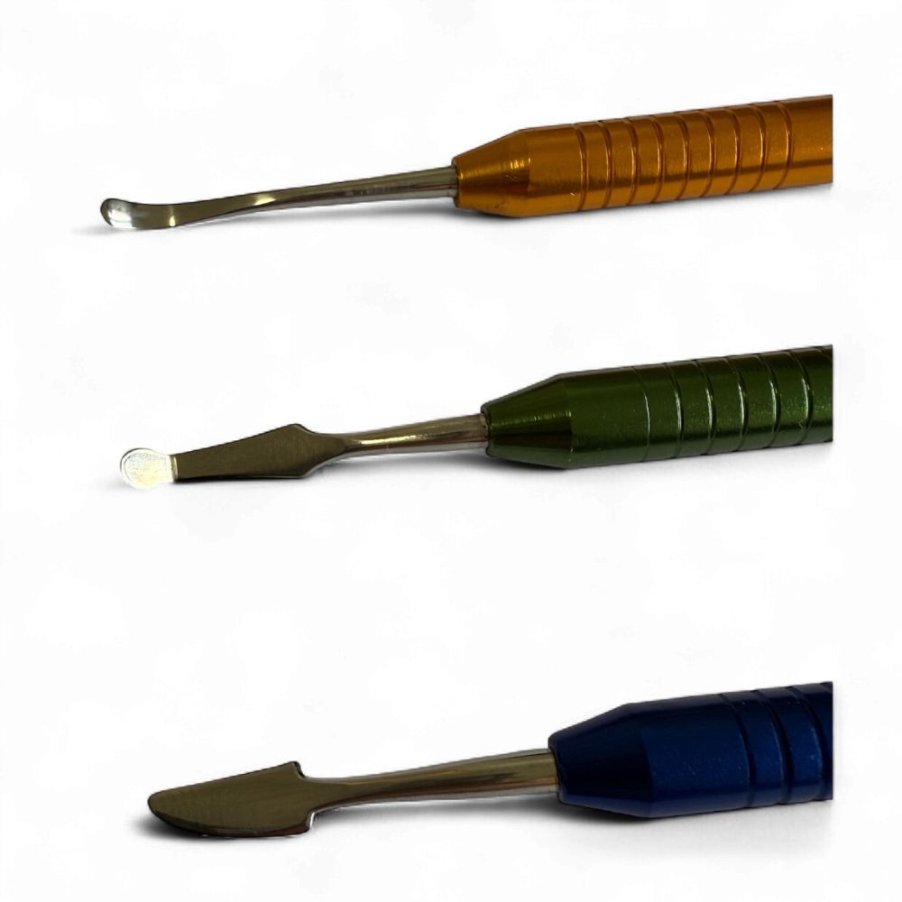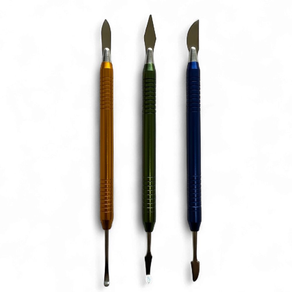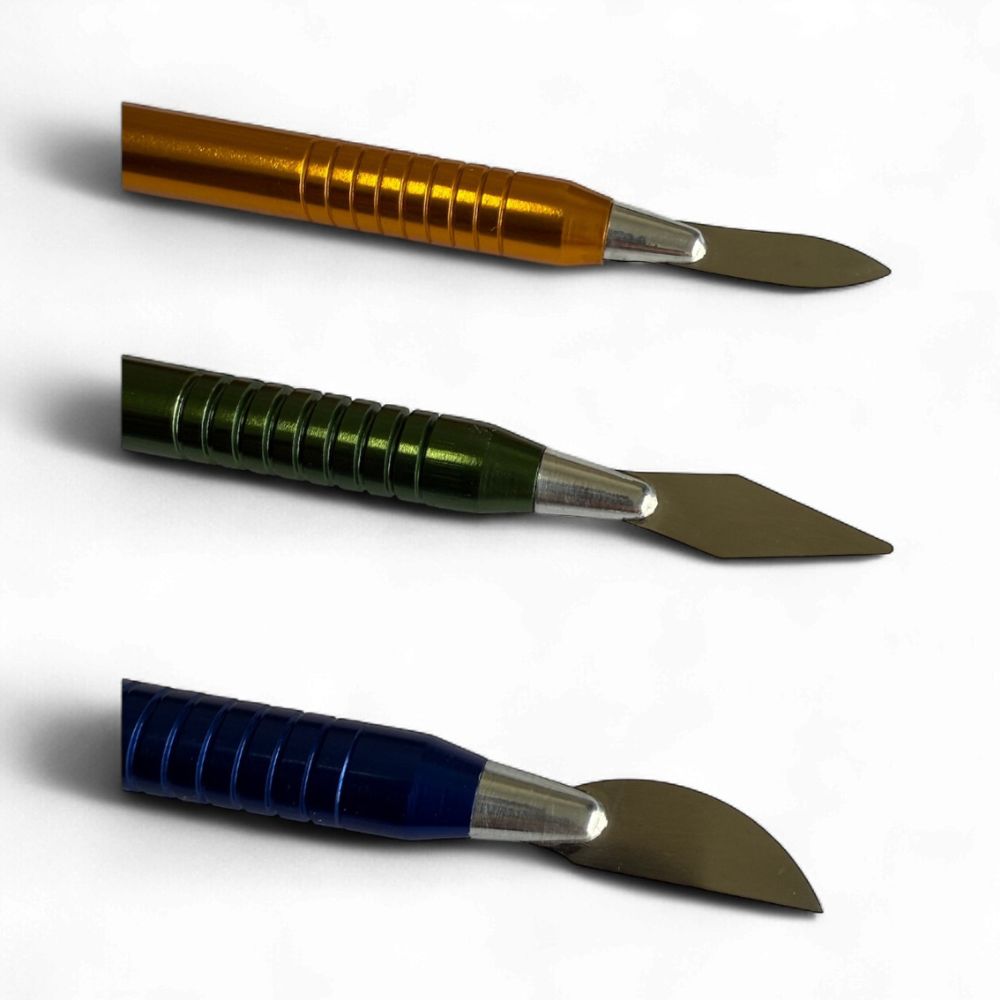Kit contendo 3 unidades diferentes de espátulas do tipo Almore (N° 1 Amarela, N° 2 Azul, N° 3 Verde).